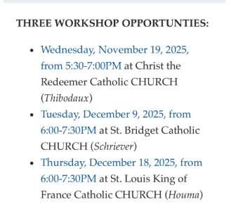 There are 3 opportunities to learn more about this beautiful ministry, and one is actually scheduled to be held at St. Bridget Church on December 9th! See below.